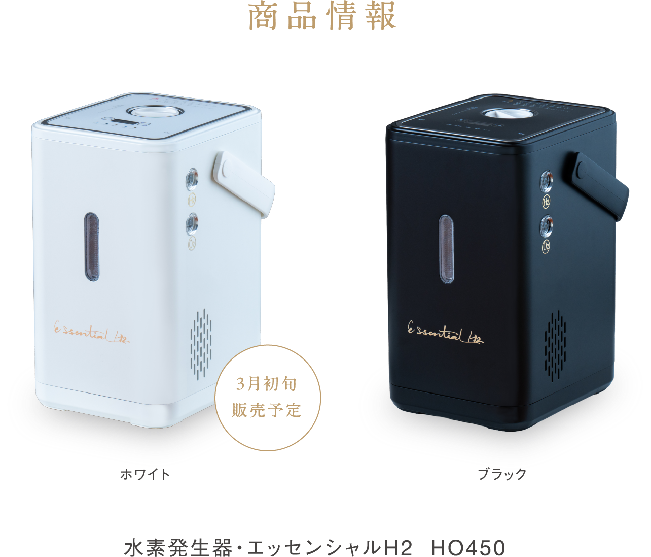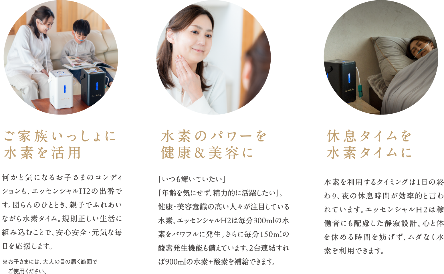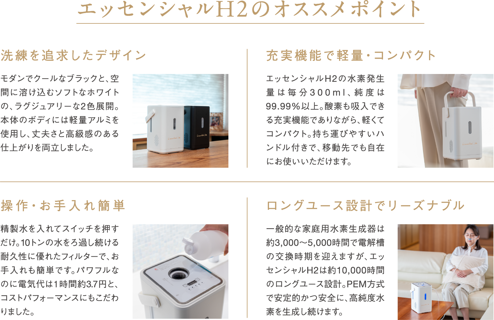 栄養、運動、休息。健康と美容に欠かせない要素に、「水素」という選択肢を加えてみませんか。エッセンシャルH2は、手軽に水素を補給できる水素発生器です。純度99.99%以上の水素を発生し続けるハイスペック型。リビングや寝室で過ごす時間が、水素でもっと価値あるものに変わります。元気とキレイのルーティーンとして、水素のパワーをお役立てください。